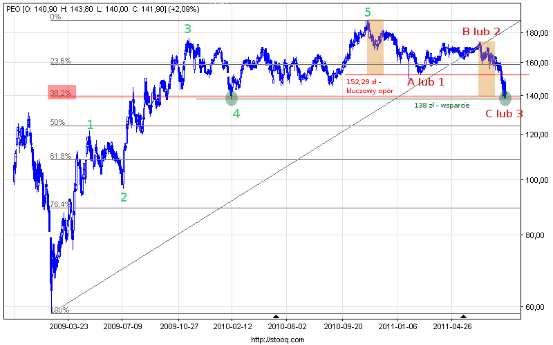 Kurs spółki Pekao S.A. od listopada 2010 r. znajduje się w fazie korekty, której poszczególne podfale można oznaczyć jako A-B-C. Do tej pory na wykresie pojawiła się już fala A oraz B, a w chwili obecnej powstaje prawdopodobnie ostatnia spadkowa fala C.