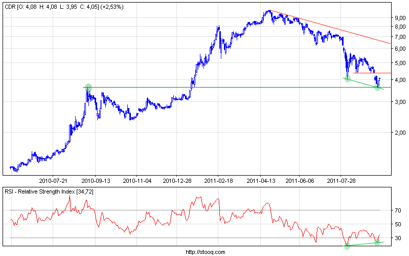 W tej okolicy znajduje się wsparcie, które tworzy szczyt z września 2009 r., co z pewnością zmotywowało stronę popytową. Kolejną korzystną dla posiadaczy akcji kwestią jest pozytywna dywergencja pomiędzy wykresem cenowym w wykresem wskaźnika RSI. W bardzo wielu przypadkach pojawienie się takiej rozbieżności jest zapowiedzią odwrócenia panującej tendencji.