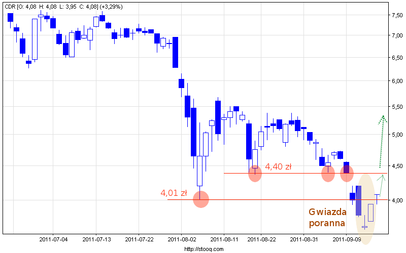 Dodatkowo dzienna świeca, która wyznaczyła ostatni dołek wraz z sąsiednimi, tworzy formację gwiazdy porannej, która jest również układem zapowiadającym odwrócenie trendu. Aby jednak formacja była kompletna kurs powinien zamknąć się powyżej połowy korpusu dużej czarnej świecy, czyli powyżej 4,01 zł. Jeśli do tego dojdzie to będzie to również pierwszy krok do trwałego przebicia oporu jaki stanowy aktualnie dołek z 5 sierpnia.