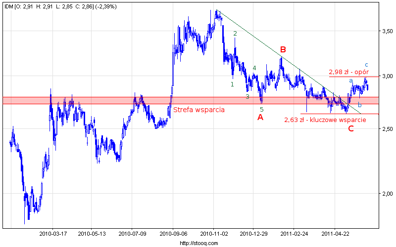Ogólna sytuacja z ostatnich miesięcy sygnalizuje możliwość ostatecznego zakończenia korekty na akcjach spółki IDM S.A. Wskazuje na to trójfalowa struktura ostatniego ruchu spadkowego oraz przebicie od dołu linii trendu spadkowego.