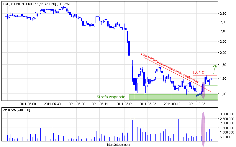 Walory spółki Dom Maklerski IDM S.A. od 31 sierpnia, kiedy to został wyznaczony lokalny szczyt na poziomie 1.79 zł, rozpoczęły powolny marsz na południe. Zniżka doprowadziła do testu wsparcia, które tworzy dołek z 9 sierpnia 2011 r.