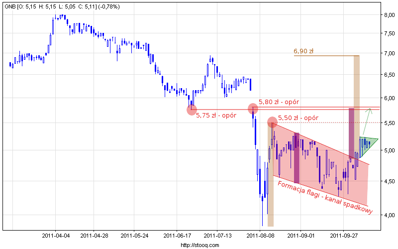 W tym miejscu należy jednakże wspomnieć o bardzo istotnej formacji, która wyrysowała się podczas ostatnich kilku sesji. Jest to znacznie mniejsza od flagi formacja chorągiewki. Jest to również układ prowzrostowy, z którego zwykle kurs wybija się zgodnie z kierunkiem poprzedzającego ją ruchu. Sygnałem do kontynuacji wzrostów w takim przypadku jest pokonanie górnej linii ograniczającej chorągiewkę. Znacznie bezpieczniej jest za taki sygnał uznać dopiero wyznaczenie nowego szczytu, czyli wybicie powyżej wierzchołek białej świecy z 6 października na poziomie 5,24 zł.
