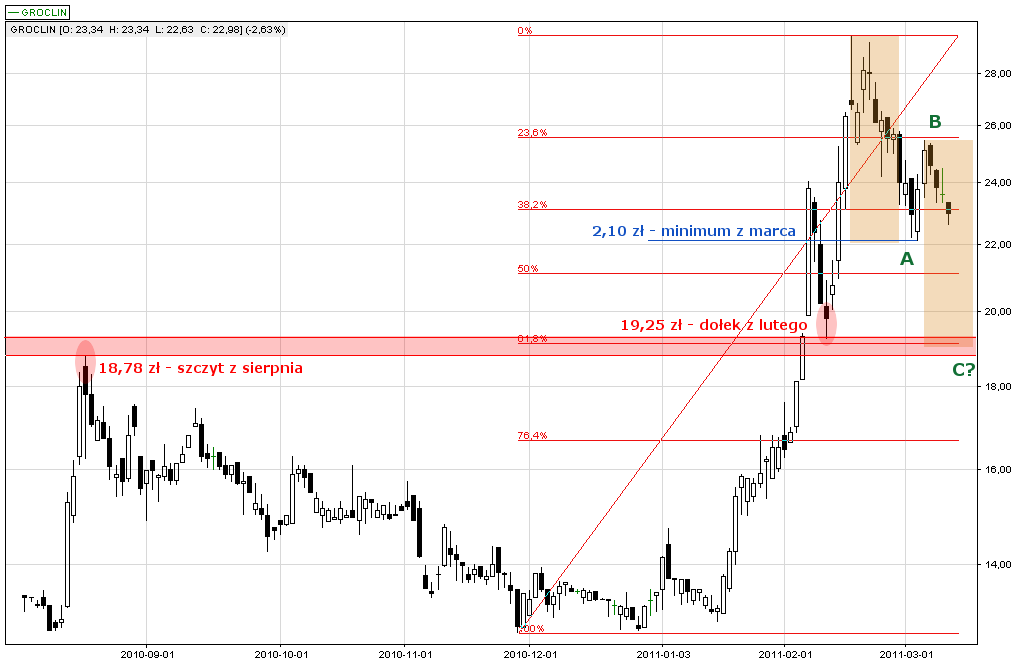 W powyższej analizie spółki Groclin odcinkiem, który jest podstawą do dokonania projekcji długości fali korekcyjnej jest ostatni impuls wzrostowy. Na wykresie poniżej zaznaczono kolejne fale zgodnie z założeniem teorii fal Elliotta. Impuls wzrostowy składa się z 5 fal co pozwala przypuszczać, że impuls spadkowy będzie składał się z 3 fal. Należy jednak zwrócić uwagę na ewentualne sygnały odwrócenia spadków na poziomie 2,10 zł gdzie znajduje się istotnie wsparcie.