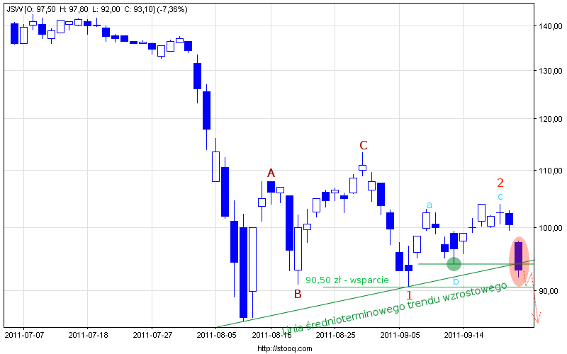 Z takim obrotem sytuacji przemawia naruszenie linii średnioterminowego trendu wzrostowego oraz przebicie ostatniego lokalnego dołka (94,15 zł) z 13 września tego roku.