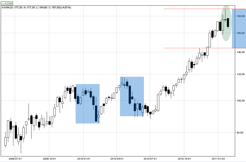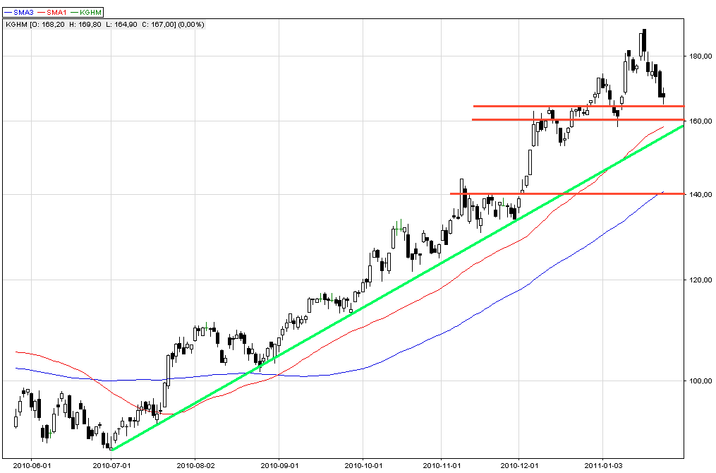 Od czerwca 2010 r. kurs KGHM rósł praktycznie bez większej korekty. Wzrosty nabrały tempa po ukazaniu się rekomendacji zawierających wycenę spółki na ponad 200 zł. Obecnie po przekroczeniu poziomu 180 zł mamy do czynienia z realizacją zysków.