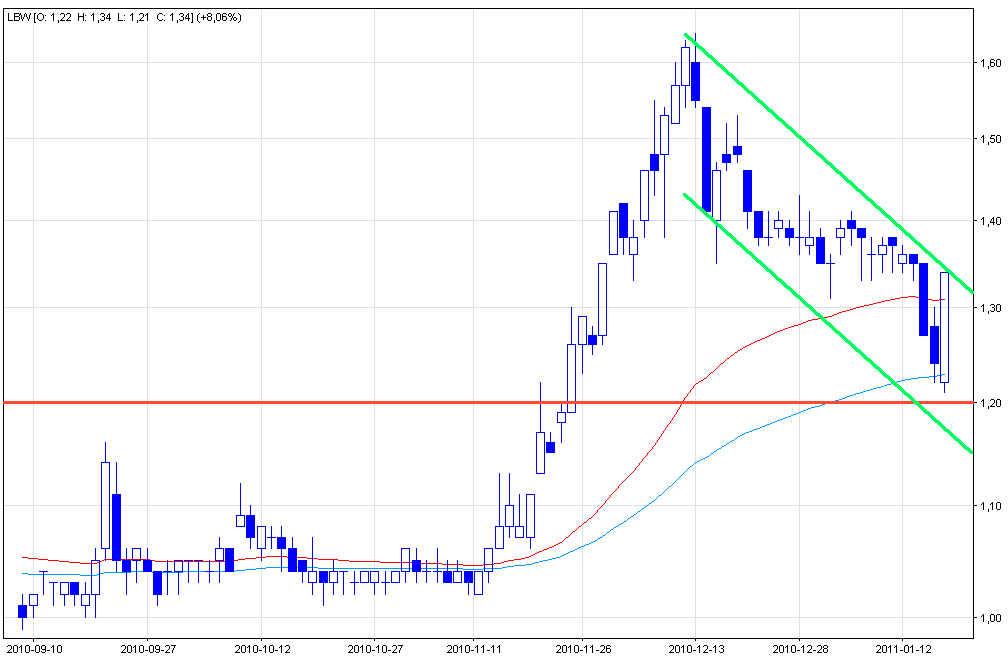 Od ponad miesiąca na walorach Lubawy mamy do czynienia ze spadkami. Jednak wiele wskazuje na to, że niedługo do głosu mogą dojść „byki”. Potwierdzeniem takiego stanu rzeczy jest długa biała świeca, która pojawiła się na ostatniej sesji przy stosunkowo dużych obrotach.