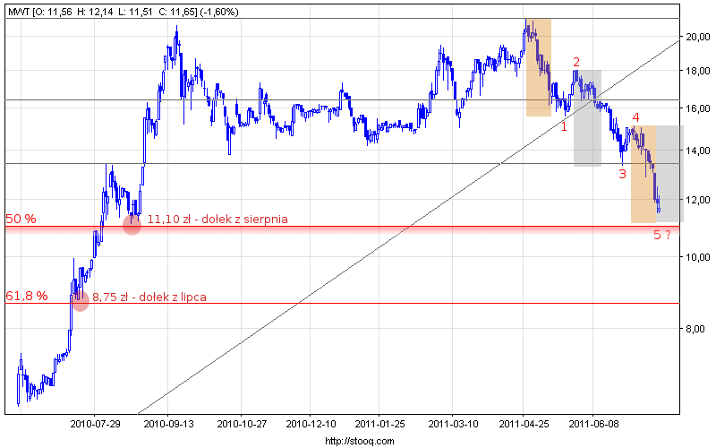 Aktualny impuls spadkowy jak dotąd posiada wyraźną pieciofalową strukturę zatem według teorii fal po zakończeniu ostatniej 5 fali powinien nastąpić ruch korygujący. W tym przypadku byłby to impuls wzrostowy. Odmierzone 100 % długości fali 1 i 3 wskazuje poziomy 11,10 zł oraz 11,12 zł. Powstaje zatem istotna strefa wsparcia, której dolnym ograniczeniem jest linia 11,08 zł. Jest to jednocześnie bardzo prawdopodobny poziom zakończenia fali 5.