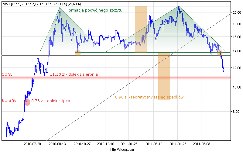 W przypadku spółki MW Trade należy mieć jednak na uwadze fakt pojawienia się prospadkowej formacji podwójnego szczytu, którą tworzy maksimum z września 2010 r. oraz z kwietnia 2011 r. Formację potwierdziło przełamanie minimum podwójnego szczytu, do którego doszło w ubiegłym tygodniu.
