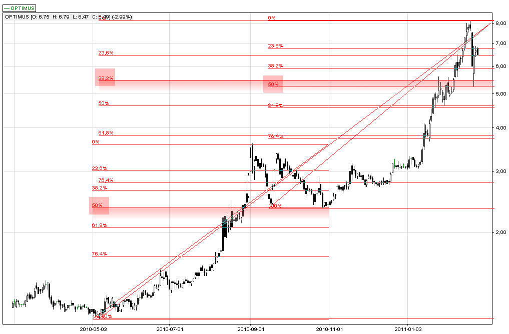 Dokonując pomiarów metodą Fibonacciego okazuje się, że aktualne spadki zatrzymały się w okolicy linii 50% zniesienia wewnętrznego poprzedniego impulsu wzrostowego. Jeśli zmierzymy długość całej fali wzrostowej, której początek sięga połowy 2010 r. otrzymamy ważny poziom Fibo, który również przebiega w rejonie zakończenia spadków. Otrzymana wartość w drugim mierzeniu to poziom 38,2%, który z wartością 50% to dwa z trzech poziomów zniesień wewnętrznych Fibonacciego, na których najczęściej dochodzi do zakończenia korekt i powrotu do głównego trendu.