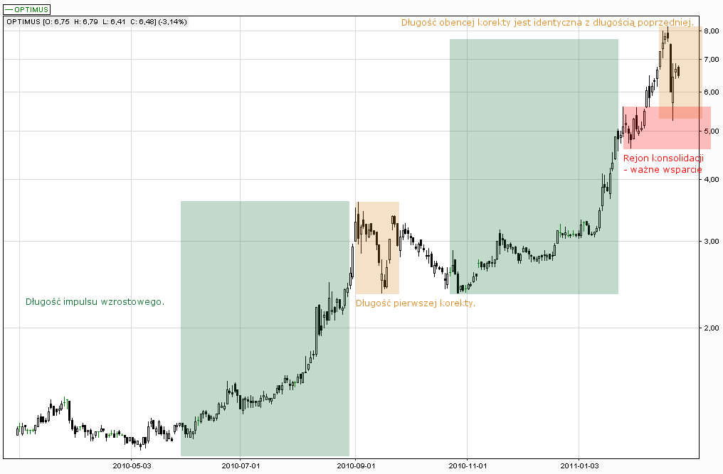 Mierząc długość pierwszego impulsu wzrostowego trwającego od kwietnia do września 2010 r. okazuje się, że mamy do czynienia wręcz z podręcznikowym przykładem naprzemiennych zniesień kierunkowych, które wchodzą w skład szerokiej gamy zastosowań poziomów Fibonacciego. Długość korekty z września ubiegłego roku stanowi 50% poprzedzającej fali wzrostowej. Nie jest to nic nadzwyczajnego dopóki nie porównamy długości obydwu korekt. Okazuje się, że porównywane odcinki są sobie równe. Jeśli obie stanowią 50% zniesienia wewnętrznego poprzedzających je impulsów wzrostowych to impulsy te również są niemal identyczne. Jest to kolejny czynnik przemawiający za zakończeniem spadków, ponieważ występujące po sobie korekty są często tej samej długości.