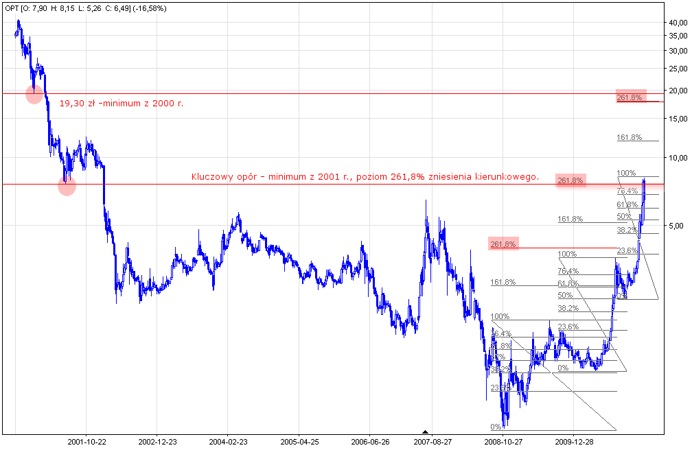 Wykres tygodniowy rzuca nieco światła na ewentualny zasięg wzrostów. W tym momencie po raz kolejny projekcję zasięgu ruchów cen umożliwiają nam metody Fibonacciego. Regularne zniesienia kierunkowe wskazują na pewną zależność pomiędzy impulsami wzrostowymi w całym ruchu wzrostowym zapoczątkowanym w 2008 r. Metoda ta wskazuje, że obecna i poprzednia fala wzrostowa zatrzymały się w okolicach 261,8% regularnego zniesienia kierunkowego. Dokonując projekcji możliwego wzrostu kolejnej fali wzrostowej otrzymujemy przedział cenowy od 17 zł do 17,90 zł. Należy dodać, że najbliższy ważny technicznie opór znajduje się dopiero w okolicy 19,30 zł. Jest to minimum z grudnia 2000 r.