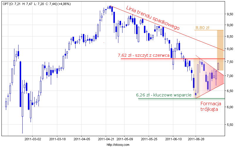 Wsparcia: 7,14 zł – górne ograniczenie formacji trójkąta, 6,26 zł – minimum z 28 czerwca 2011 r.