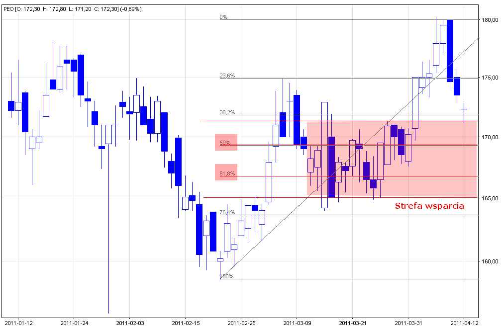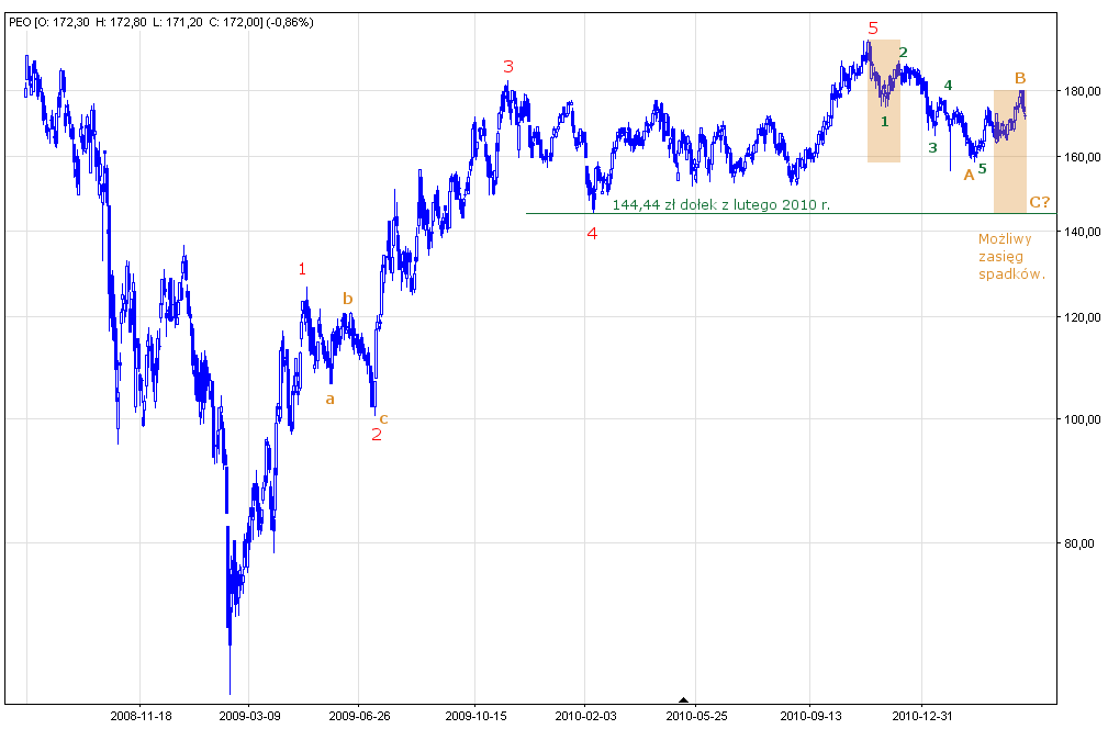 Cały ruch wzrostowy trwający dokładnie od dołka ze stycznia 2009 r. do ostatniego szczytu z listopada 2010 r. utworzył pięciofalową strukturę, czyli pełny cykl impulsu według teorii fal Elliotta. Do maja 2009 mieliśmy do czynienia z 1 falą wzrostową, po której nastąpiła klasyczna korekta ABC – fala 2 – trwająca do lipca 2009. Kolejna 3 fala wzrostowa trwała do listopada. Po niej nastąpiła wydłużona fala 4 – korekta płaska – trwająca do września 2010. Ostatnia fala 5 zakończyła się na poziomie 197,20 zł w listopadzie 2010 r. Po takim cyklu zwykle następuje znaczna korekta, która również pojawiła się na wykresie spółki Pekao. Opisana korekta zakończyła się na poziomie w lutym obecnego roku na poziomie 158,60 zł, po czym ponownie kurs powrócił do zwyżki. Impuls wzrostowy jest znacznie dłuższy niż korekty w poprzedzającym impulsie spadkowym co też pozwala sądzić, że jest to początek nowego trendu wzrostowego.