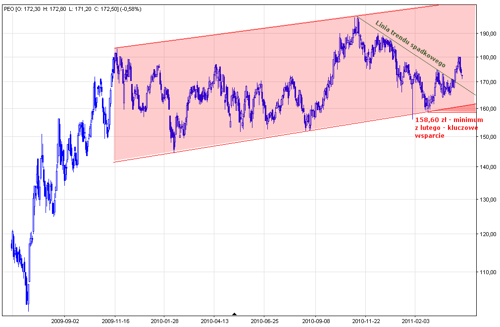 Przy określeniu, który z opisanych scenariuszy jest bardziej prawdopodobny z pomocą przychodzi klasyczna analiza wykresów. Wyznaczając linie trendu dwuletniego ruchu notowań spółki okazuje się, że szczytu z 2009 roku kurs porusza się wewnątrz wzrostowego kanału cenowego. W lutym tego roku kurs odbił się od dolnego ograniczenia co wskazuje, że obecnie cena może podążać w kierunku górnej linii kanału. Za wzrostami przemawia również wybicie się kursu ponad linię trendu spadkowego, która ograniczała od góry ostatnie spadki.
