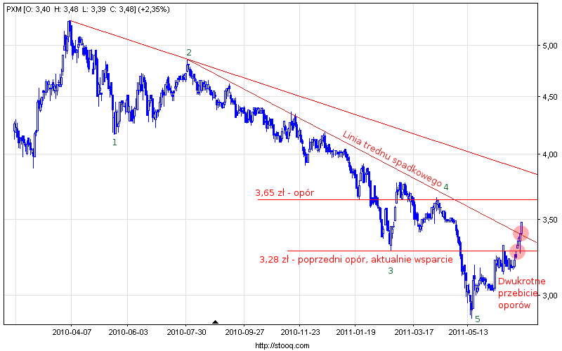 4 lipca na otwarciu kurs znalazł się powyżej oporu jaki tworzył dołek ze stycznia tego roku (koniec fali 3 w trendzie spadkowym) na poziomie 3,28 zł. Tego dnia na wykresie pojawiła luka wzrostowa, co przyspieszyło wzrosty na następnych sesjach. Pokonanie tego oporu jest piewrszym pozytywnym sygnałem dla posiadaczy akcji. Należy dodać, że poprzednia próba wybicia ponad wspomniane ograniczenie zakończyła się niepowodzeniem.