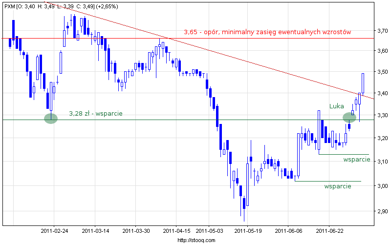Wsparcia: linia trendu spadkowego; 3,28 zł – dolna krawędź luki, minimum wczorajszej świecy, dołek z lutego; 3,13 zł minimum lokalne z czerwca 2011r.; 3,02 zł – poprzednie czerwcowe minimum.