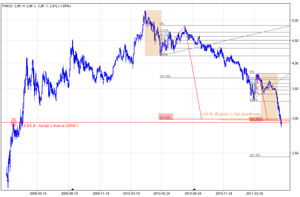 Analiza wykresu metodą Fibonacciego również potwierdza wskazania użytych powyżej technik. 100 % zniesienia kierunkowego Fibo pierwszej fali spadkowej obecnego trendu wskazuje na 2,97 zł. 261,8 % zniesienia zewnętrznego pierwszej korekty – fali 2 – przebiega na linii 2,99 zł. No i wreszcie 161,8 % zniesienia zewnętrznego drugiej korekty – fali 4 – wskazuje na 2,96 zł. Reasumując – trzy pomiary Fibo wskazują na jeden rejon, co dość jednoznacznie definiuje go jako bardzo prawdopodobne miejsce odwrócenia trendu.