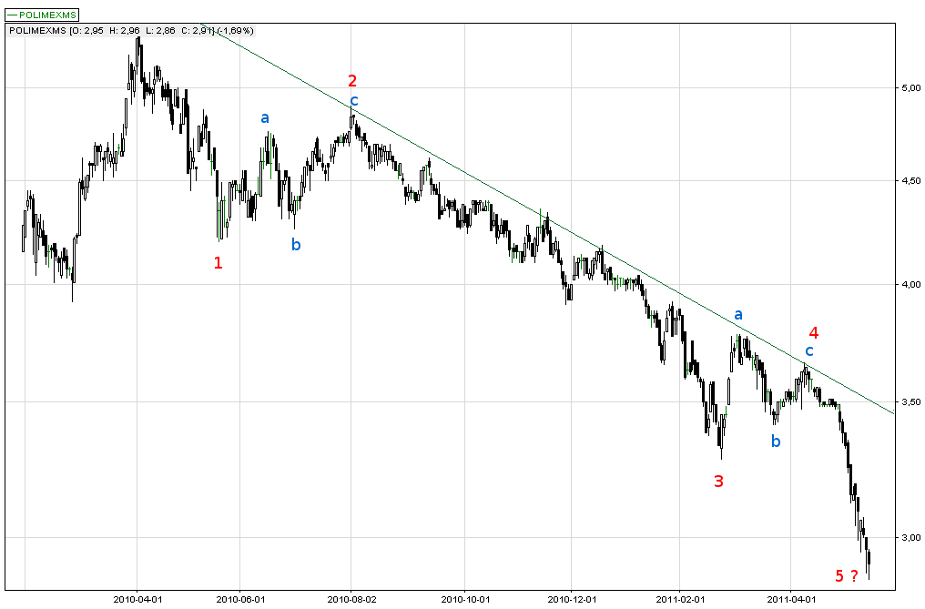 Cały ruch spadkowy zapoczątkowany w kwietniu 2010 r. charakteryzuje się pięciofalową strukturą. Pierwszy impuls spadkowy zakończył się miesiąc po rozpoczęciu zniżki. Kolejny ruch to pierwsza korekta abc trwająca do sierpnia 2010 r. Następnie na wykresie pojawił się kolejny impuls spadkowy – najdłuższa fala 3. W pierwszych miesiącach 2011 r. pojawiła się druga korekta – fala 4, która zakończyła się w kwietniu tego roku. Aktualny, dość dynamiczny ruch spadkowy tworzy falę 5. Zatem według teorii fal Elliotta za nami pełny impuls, po którym powinno dojść do odwrócenia trendu bądź większej korekty.