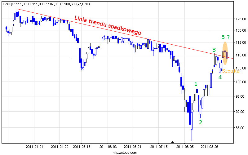 Kurs spółki „Bogdanka” utworzył mianowicie typową falę impulsu. Zatem z czysto technicznego punktu widzenia z kształtu poszczególnych fal wynika, że poprzednie spadki były korektą, która zakończyła się, a obecny ruch posiadający znamiona fali impulsu, może być 1 falą w nowym trendzie wzrostowym.