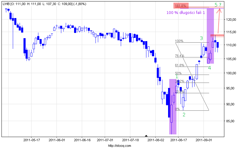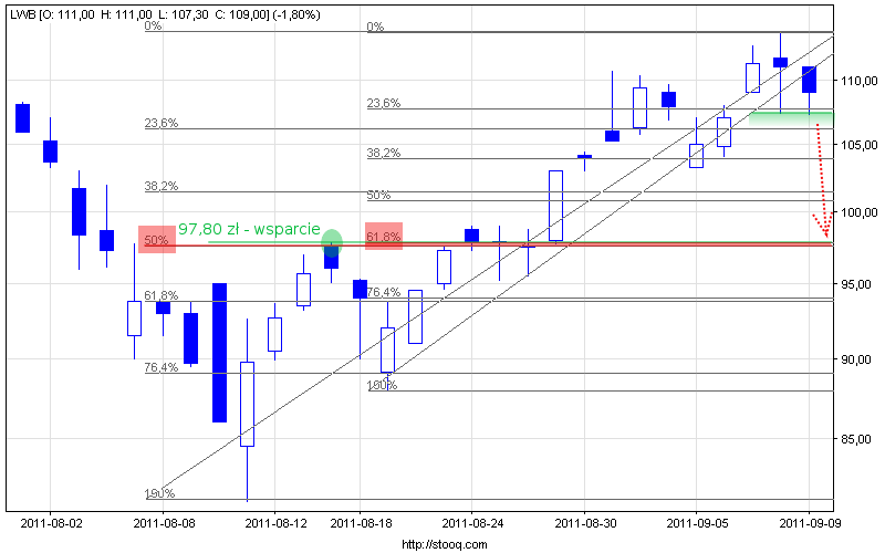 Jeżeli cena akcji „Bogdanki” zejdzie poniżej będzie to potwierdzenie prospadkowej wymowy formacji i prawdopodobnie dojdzie wtedy, w optymistycznym scenariuszu, do korekty aktualnych wzrostów. Taki ruch spadkowy może znieść kurs w okolice 97,80 zł gdzie znajduje się szczyt z 17 sierpnia, czyli klasyczne wsparcie oraz dwa istotne poziomy Fibo – 50 % oraz 61,8 % zniesienia wewnętrznego aktualnego impulsu wzrostowego.