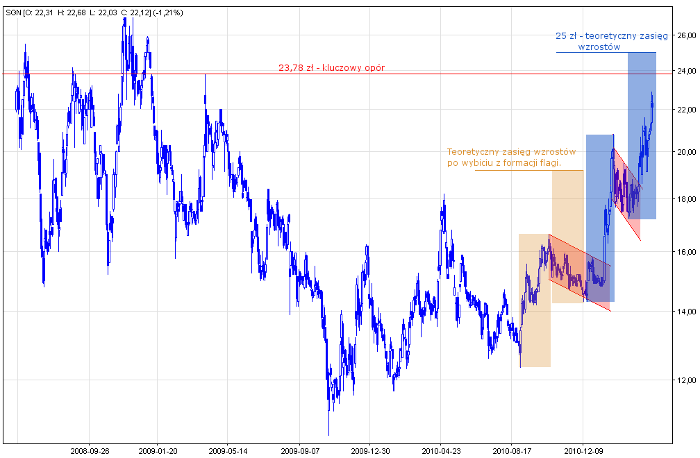 Początek roku 2011 r. przyniósł przyśpieszenie ruchu wzrostowego. W styczniu doszło do wybicia górą z formacji flagi, która formowała się na wykresie od października 2010r. W tym czasie kurs poszybował znacznie powyżej 20 zł, a tym samym przekroczył o ponad złotówkę teoretyczny zasięg wzrostów po wybiciu ze wspomnianej formacji. Zwyżka zakończyła się dokładnie 28 stycznia, kiedy to cena osiągnęła swoje lokalne maksimum na poziomie 20,80 zł. Tego dnia rozpoczęła się realizacja zysków, która uformowała kolejną prowzrostową formacją przypominającą kształtem flagę. 10 marca kurs znalazł się powyżej formacji dając początek zwyżce trwającej obecnie. W przypadku ostatniej wspomnianej formacji teoretyczny zasięg wzrostów to okolice 25 zł (zaznaczono na niebiesko).