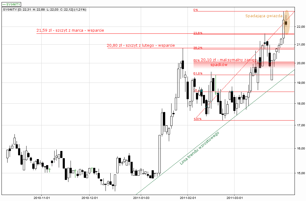 Widać wyraźnie, że trend wzrostowy na akcjach spółki Sygnity zapoczątkowany w 2009 r. charakteryzuje się częstymi korektami. Na ostatniej sesji na wykresie pojawiła się spadająca gwiazda. Jeśli na następnej sesji kolejna świeca zamknie się poniżej minimum formacji spadającej gwiazdy potwierdzi to jej spadkową wymowę. Oba te czynniki mogą sugerować, że pomimo ogólnej prowzrostowej tendencji może dojść do krótkoterminowej zniżki. Porównując niedawne impulsy wzrostowe i długości następujących po nich korekt dochodzi się do wnioski, że ewentualny spadek nie powinien przekroczyć 50% zniesienia wewnętrznego obecnej fali wzrostowej. Linia 50% zniesienia Fibo przebiega na poziomie 20,10 zł gdzie znajduje się również aktualna linia trendu wzrostowego, co dodatkowo powinno zmotywować byki do obrony tego rejonu gdyby niedźwiedziom udało się zepchnąć kurs w te okolice. Wcześniej jednak strona podażowa będzie musiała uporać się ze dwoma klasycznymi poziomami wsparcia, które tworzą dwa ostatnie lokalne szczyty. Wsparcia znajdują się kolejno na poziomie 21,59 zł oraz 20,80 zł. Istnieje duże prawdopodobieństwo, że możliwa korekta zawróci już na jednym z wymienionych poziomów.
