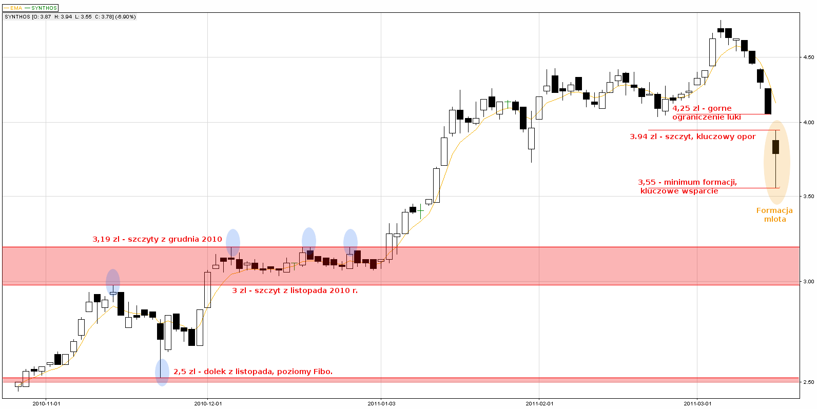 Opory: 3,94 zł – maksimum formacji młota, 4,25 zł – minimum długiej czarnej świecy, górna krawędź luki.