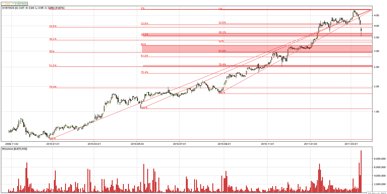 Dokonując pomiaru ostatniej fali wzrostowej metodą Fibonacciego na wykresie powstaje kilkanaście poziomów, na których może dojść do zatrzymania ewentualnych spadków. Należy jednak wziąć pod uwagę tylko dwa rejony ze względu na występujące w tych samych miejscach klasyczne wsparcia. Na linii 3,19 zł znajdują się trzy szczyty z grudnia 2010 r. Idealnie na tym samym poziomie znajduje się linia 50% zniesienia wewnętrznego Fibio. 19 gr. poniżej przebiegają dwa nachodzące na siebie poziomy Fibonacciego. Obydwa opierają się o szczyt z listopada 2010 r. co tworzy dolne ograniczenie pierwszej znaczącej strefy wsparcia. Drugi i ostatni rejon to okolice 2,50 zł. Znajdują się tu jednocześnie linie 76,4% oraz 61,8% zniesień Fibo z dwóch różnych mierzeń oraz linia wyznaczona przez dołek z listopada i szczyt z października ubiegłego roku.