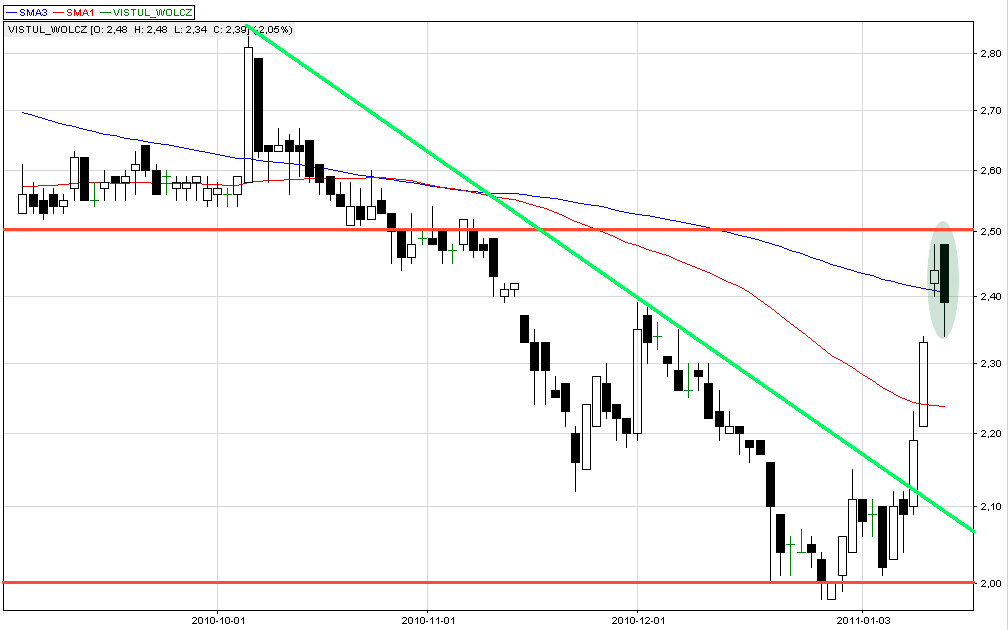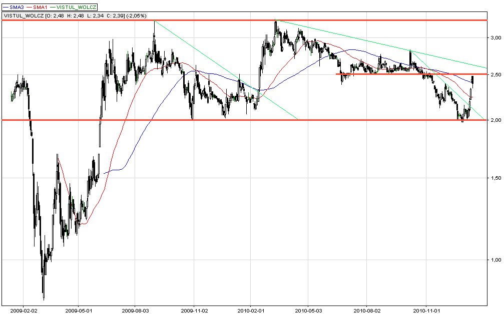 Cena akcji spółki Vistula od czerwca 2009 r. porusza się w trendzie bocznym. Trend od dołu ograniczony jest poziomem 2 zł, natomiast górne ograniczenie to 3,29 zł. Zarówno jeden jak i drugi poziom był już kilkukrotnie testowany i za każdym razem rynek zawracał w tych okolicach.