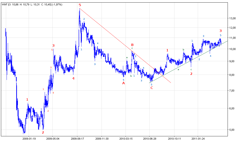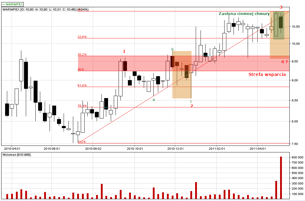 Z wykresu tygodniowego wynika, że obecna zwyżka znajduje się w końcowej fazie 3 fali – niższego rzędu. Fala ta składa się z 5 podfal, czyli jest to pełny impuls. Dodatkowo przy dużych obrotach powstaje obecnie prospadkowa formacja zasłona ciemnej chmury, w której to zamknięcie świecy czarnej jak do tej pory znajduje się poniżej połowy korpusu świecy białej. Bardzo prawdopodobne jest więc, że przed pojawieniem się fali 5 czeka nas jeszcze korekta. Narzędzia analizy technicznej wskazują, że możliwy zasięg zniżki to przedział pomiędzy 9,26 zł a 9,66 zł. Strefę tą ograniczają linie wyznaczone przez zniesienia wewnętrzne Fibonacciego 38,2% oraz 50 % poprzedniego impulsu wzrostowego. Linie te potwierdzone są przez klasyczne wsparcia wyznaczone przez szczyty z ostatnich miesięcy 2010 r. 100 % długości poprzedniej korekty również wskazuje na tą strefą, a dokładnie na poziom 9,54 zł.