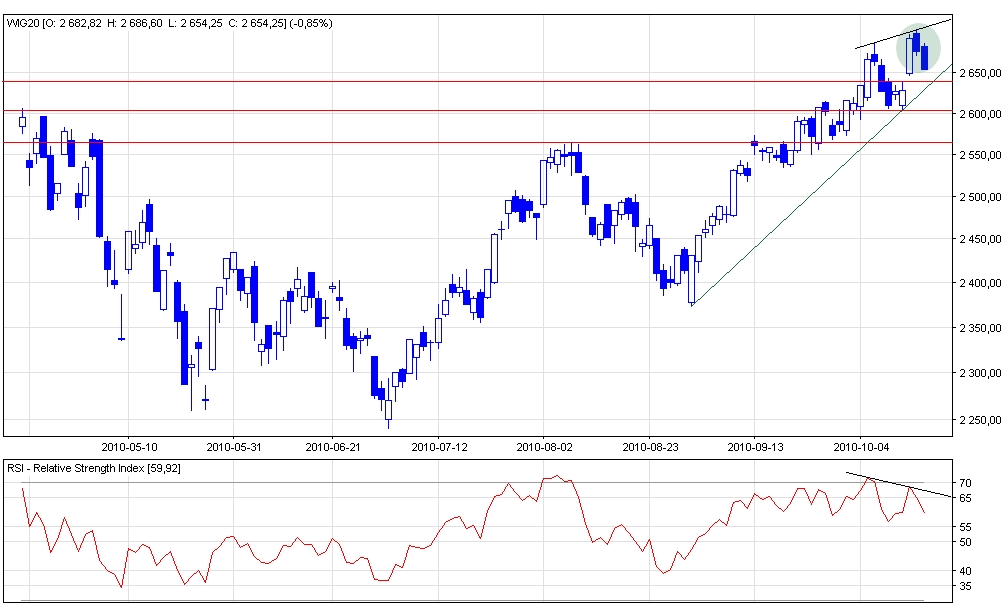 Na korzyść niedźwiedzi przemawia również negatywna dywergencja (zaznaczona czarnymi liniami) indeksu z wskaźnikiem (oscylatorem) RSI. Chodzi o to, że wartości indeksu WIG20 z 14 października jest większa niż poprzednie maksimum z 6 października, a na wykresie RSI widać sytuację odwrotną. Ostatni szczyt położony jest niżej niż poprzedni.