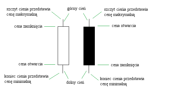 Na rysunku poniżej przedstawiono sposób powstawania pojedynczej świecy. Z lewej strony znajduje się wykres przedstawiający ruch ceny instrumentu finansowego w dowolnym przedziale czasowym. Dla ułatwienia przyjmijmy, że jest to jedna sesja. Zatem cena otwarcia w danym dniu wyznaczyła minimalny poziom korpusu świecy. Następnie kurs drastycznie spadł osiągając swoje minimum mniej więcej w połowie sesji. Znaczne spadki odzwierciedla długi dolny cień, którego koniec wyznacza wspomniany minimalny poziom ceny. W drugiej części sesji doszło do znacznych wzrostów, które wyniosły kurs znacznie powyżej poziomu otwarcia. W końcówce sesji kurs osiągnął swoje maksimum wyznaczając tym samy wierzchołek górnego cienia. Cena zamknięcia znajduje się poniżej szczytu i wskazuje górny poziom korpusu.