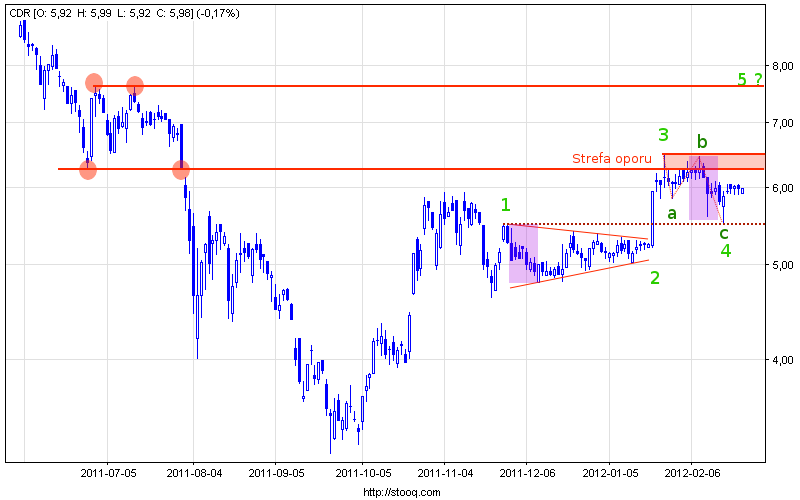 Jeśli przyjrzymy się impulsowi wzrostowemu, który nastąpił po największej jak do tej pory korekcie z przełomu października i listopada 2011 r. okazuje się, że według teorii fal Elliotta mamy za sobą dwa fale wzrostowe oraz dwie korekty. Po fali pierwszej na wykresie pojawiła się korekta w kształcie trójkąta symetrycznego. Ruch korygujący zakończył się silnym impulsem wzrostowym (fala 3), który wyznaczył nowy lokalny szczyt na poziomie 6,49 zł. Aktualnie mamy więc do czynienia z 4 falą korygującą, która kształtem odpowiada korekcie prostej abc. Istotne jest, że w przypadku spółki CD Projekt RED koniec fali 4 nie nachodzi na szczyt fali 1. Nie ma zatem mowy o złamaniu jednej z najważniejszej zasad teorii fal.