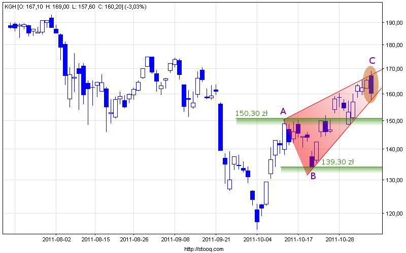 Nie jest to jeszcze koniec oznak słabości. O wiele bardziej wiarygodnym sygnałem, który może wskazywać na zakończenie wzrostów to układ jaki powstaje na wykresie KGHM od ponad dwóch tygodni. Mowa tu o kształcie aktualnej drugiej fali wzrostowej (trzeciej według teorii Elliotta), który idealnie wpisuje się w dwie zawężające się linie wsparcia i oporu tworzące wspólnie formację klina zwyżkującego. Klin zwyżkujący należy do formacji, które bardzo często sprawdzają się w praktyce, a wybicie dolnego ograniczenia układu zwykle kończy się silnym spadkiem lub nawet rozpoczyna trend spadkowy.