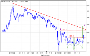 Wczorajsza biała świeca, która powstała przy znacznie większych nich dotychczas obrotach dała pierwszy sygnał powrotu popytu na parkiet. Dzisiejsze wyjście kursu powyżej wspomniany opór na poziomie 2,25 zł potwierdziło powrót kupujących i znacznie zwiększyło prawdopodobieństwo na to, że na wykresie Wasko powstaje właśnie 2 fala wzrostowa (3 według teorii fal Elliotta). W takiej sytuacji byki powinny zaatakować szczyt fali 1, czyli poziom 2,60 zł.